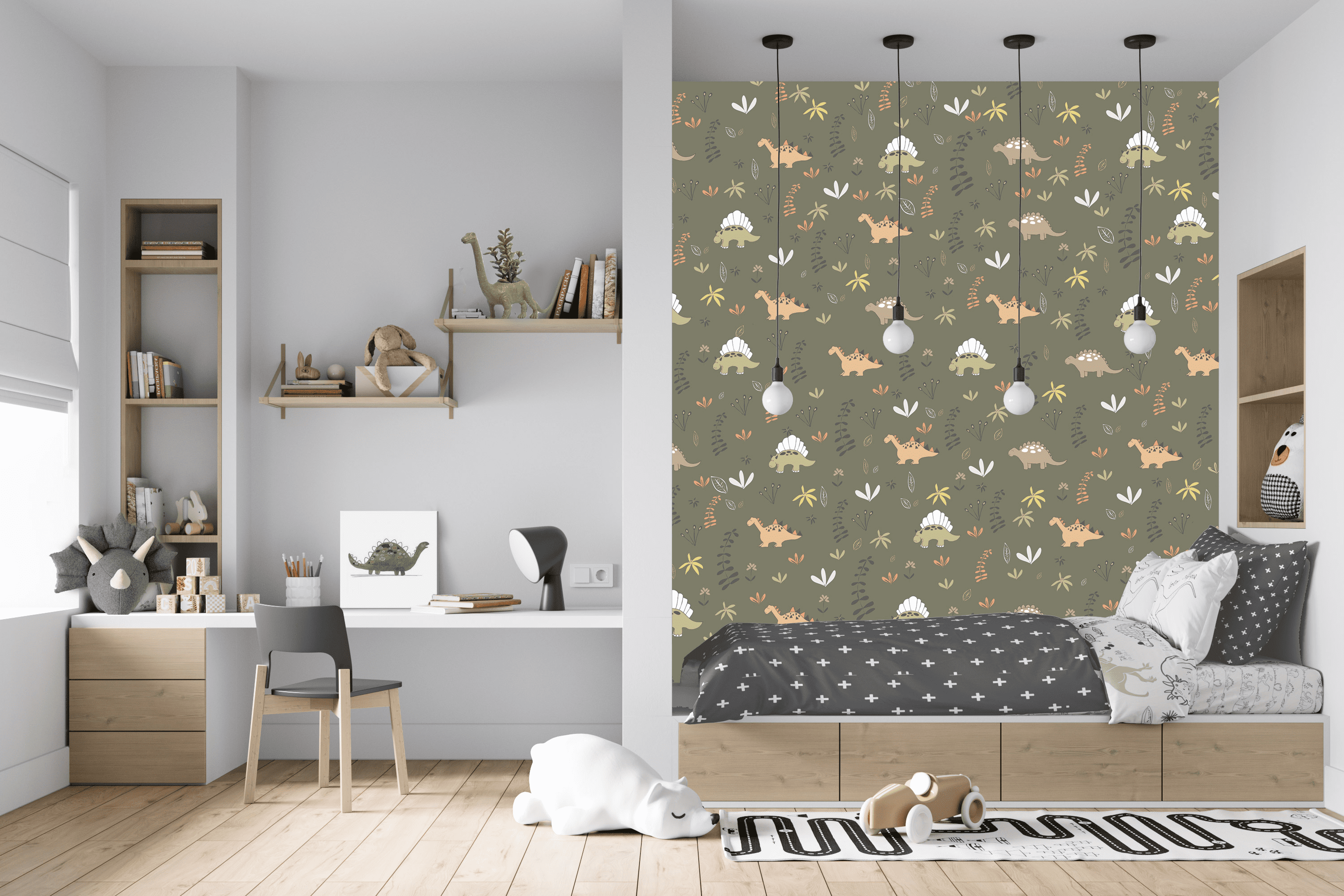 Les petits Dinosaures, ont été créés par Valérie, inspirés des histoires pour enfants, ce papier peint a été pensé pour une chambre d’enfant ou une salle de jeux