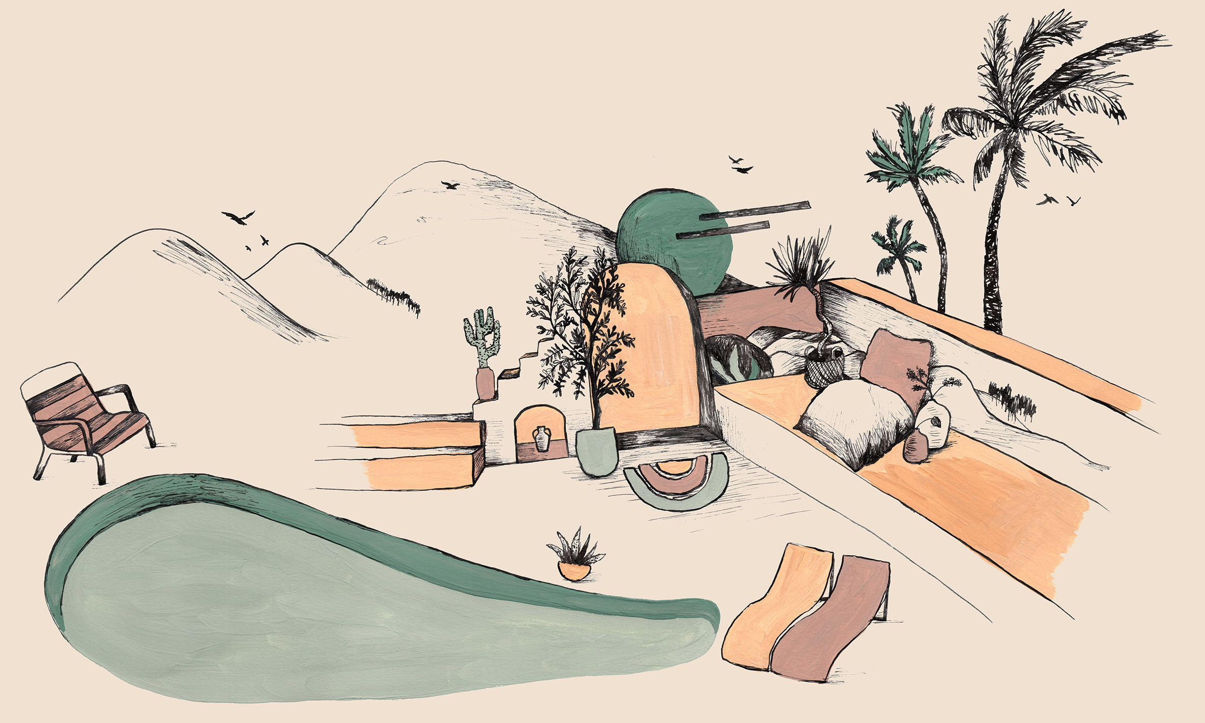Cette fresque a été réalisée à partir d’un moodboard « Maison du Sud ». Ce papier peint inspiré des étés chauds, nous invite à prolonger nos vacances en ramenant un peu de chaleur dans nos intérieurs. Un panoramique dessiné par Sarah ! Découvrez le également en version blanche ici